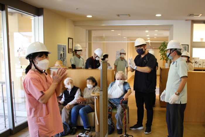 今回は、デイサービスご利用者様にご協力頂き迅速な避難を行いました。