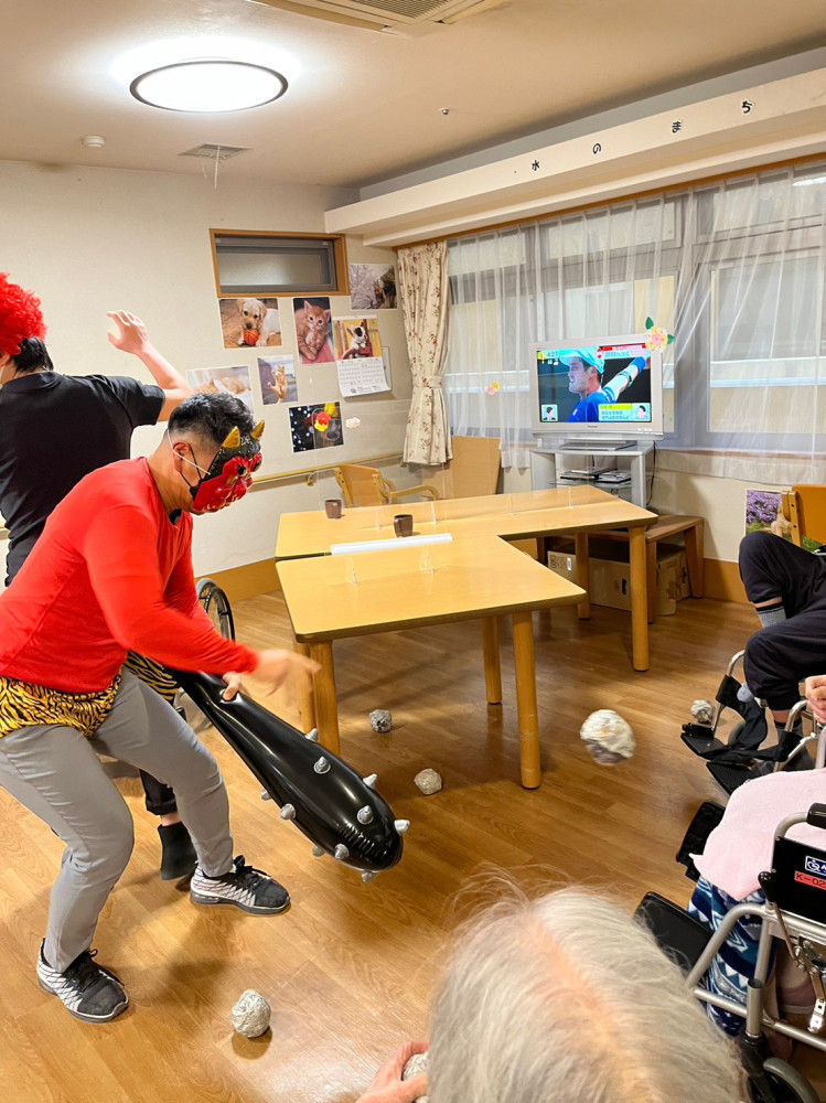 職員が鬼の仮面をつけ、豆まきや伝統的な行事を通じて皆さん笑顔で行えました。