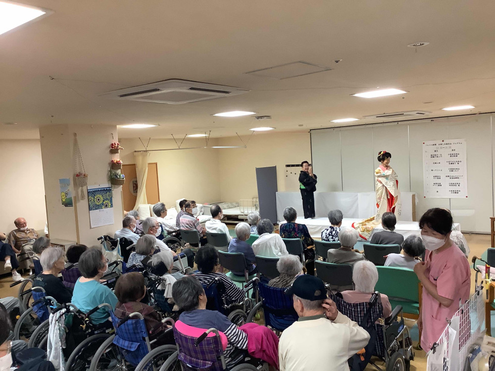 美しい歌声や華やかな踊りに、参加されたデイサービス利用者や特別養護老人ホームの入居者の皆さまも笑顔で拍手を送り、楽しいひとときを過ごしました。