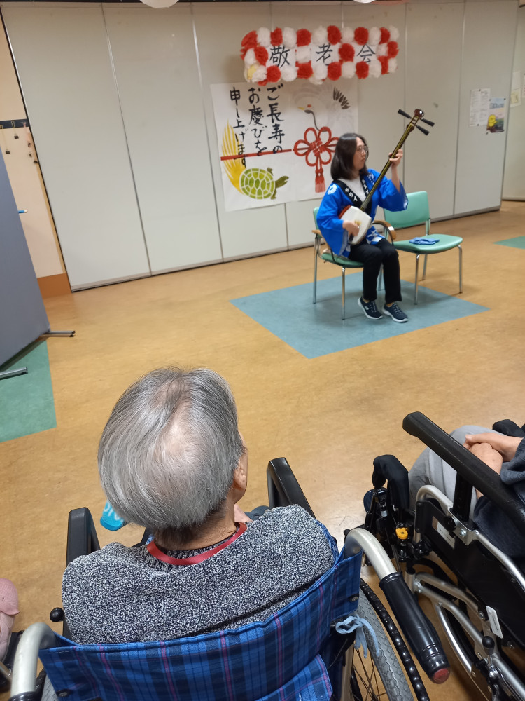 職員により、三味線の演奏。音が部屋中響いて、素敵な音色。ご利用者様聞き入っていました。