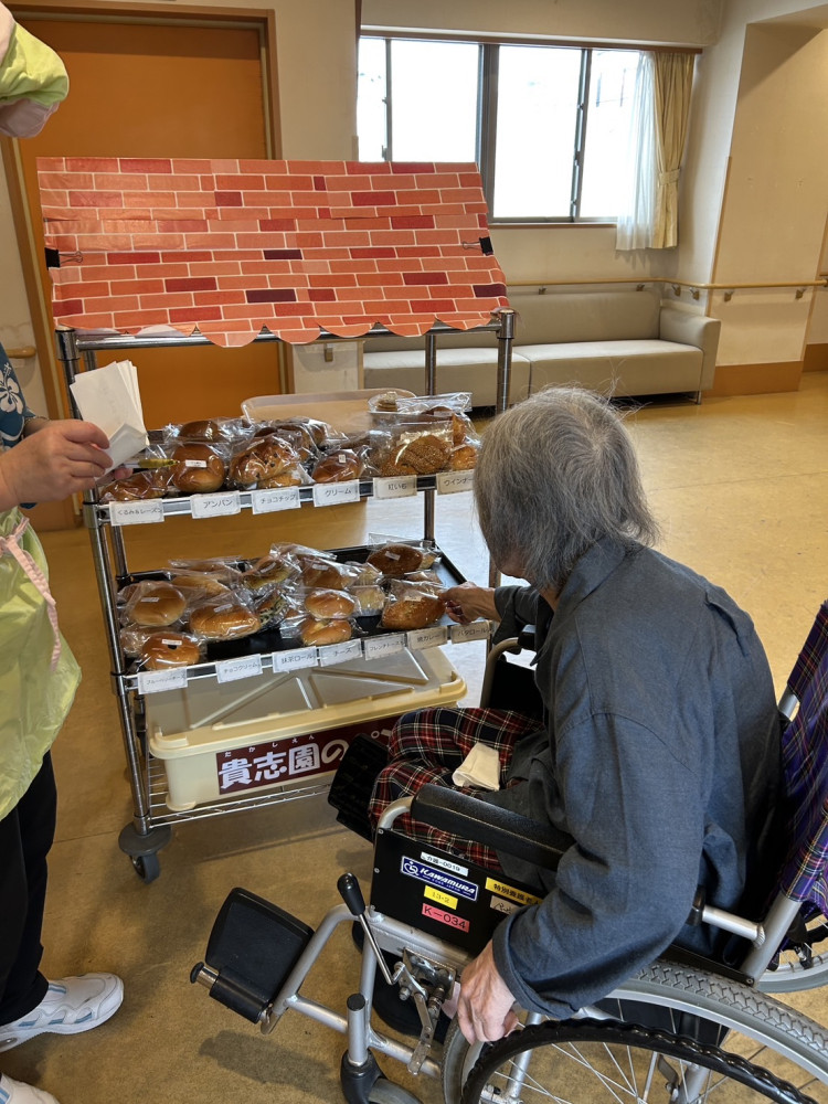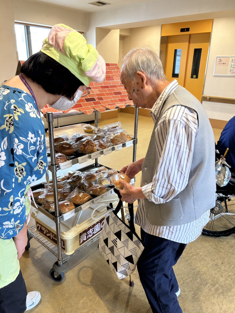 9/19サライで移動パンを行いました。グランドールパン屋さんで、購入しました。11種類の中から個々に選びます。どれにしょうか?ご利用者様は悩みます。こしアンパンは一番人気です。