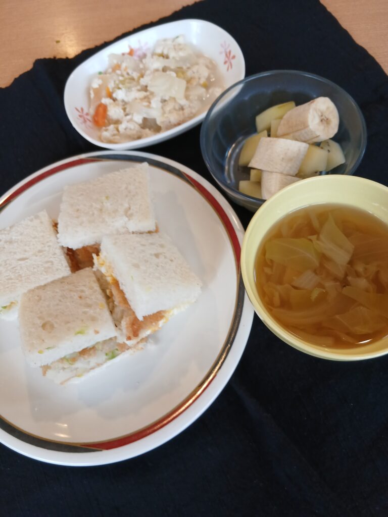 コロッケ・卵サンド 豆腐グラタン・野菜スープ・季節のフルーツ