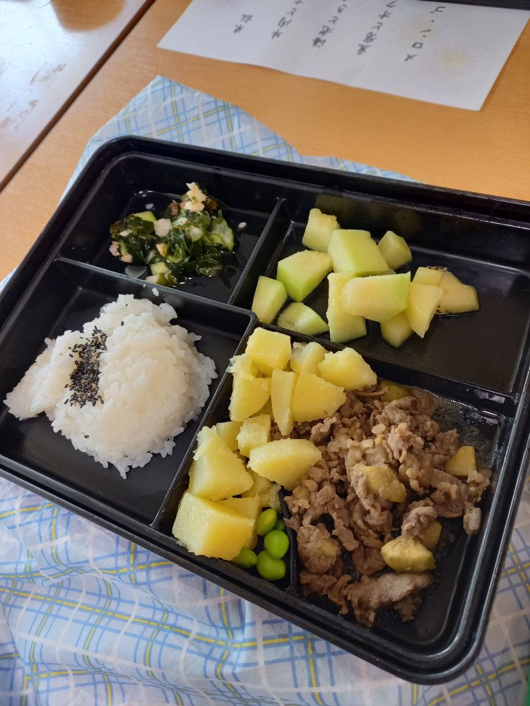 8/8 月ユニットにてご飯胡麻かけ・牛肉炒め・酢の物・季節のフルーツ・清汁