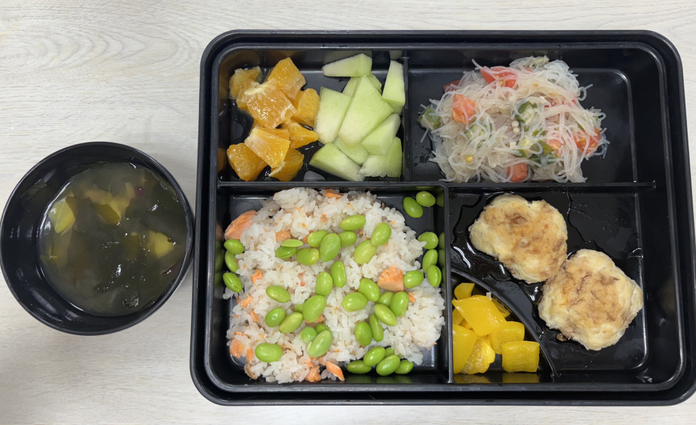 8/29 空ユニットにて鮭ご飯・つくねバーグ・オクラトマト酢の物・季節のフルーツ・味噌汁