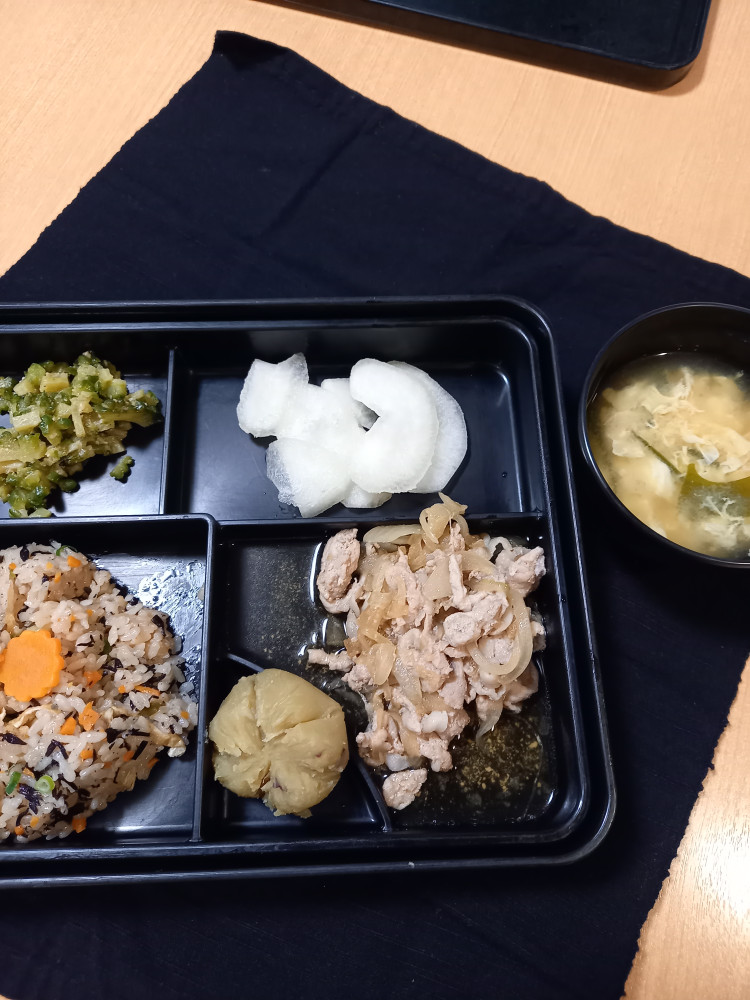 9/12 風ユニットにてひじきご飯・豚肉生姜炒め・ゴーヤの胡麻和え・季節のフルーツ・かき卵汁